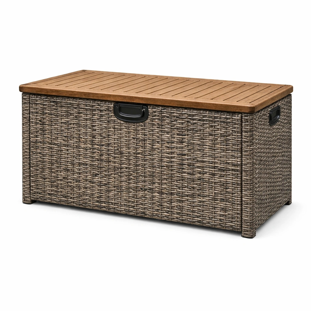 Arcón de almacenamiento para jardín de ratán marrón con tapa de madera