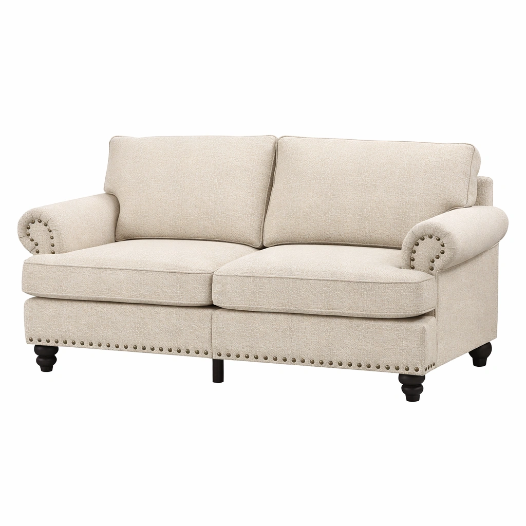Sofá de dos plazas beige de tela y madera