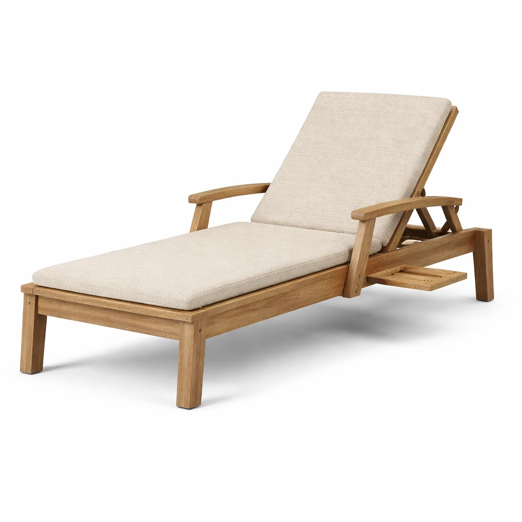 Material principal: madera de teca. Cojín en tejido de poliéster beige. Respaldo ajustable en múltiples posiciones. Dimensiones: longitud 200 cm, anchura 70 cm, altura 35 cm. Peso: 20 kg. Cojín incluido. Estructura resistente. No requiere montaje. Limpiar con un paño húmedo, evitar limpiadores abrasivos. Uso en superficies planas.